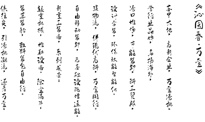 量身定制,港口、堆場,散體和粉體物料,裝船、堆高、輸送設(shè)備,工藝設(shè)計(jì)、設(shè)備制造 和安裝調(diào)試。提供整體解決方案和技術(shù)支持。提供全新的港口裝卸理念,輕松擴(kuò)大港口經(jīng)營范圍。